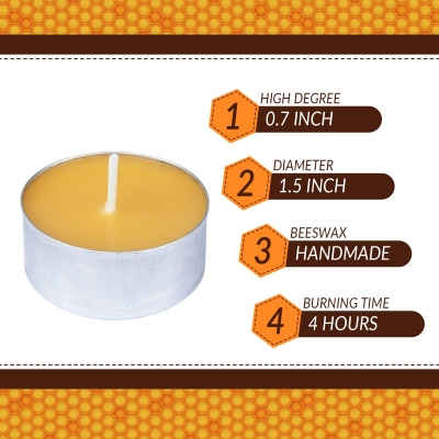 SUBMIT INQUIRY Contact USThis classic aluminum cup beeswax tealight is the perfect combination of functionality and natural quality. We offer a variety of specifications, including different burn times of 4, 4.5, and 5 hours, to precisely meet your specific requirements. Each tealight is poured into a lightweight and durable aluminum cup and is made from 100% pure natural beeswax, ensuring a clean, non-toxic burn while emitting a subtle, natural honey aroma. As a professional candle factory, we provide a stable and reliable bulk supply to clients worldwide, making us an ideal choice for your commercial procurement needs.
